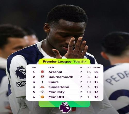 除了阿森纳开局稳定发挥之外,热刺凭借本轮客场3-0击败埃弗顿的胜利,积17分升至积分榜第3位,距离领头羊阿森纳5分。热刺本赛季在前5个英超客场拿到13个积分,追平队史在20-21赛季创造的纪录。其他“BIG6”球队当中,曼城排第5,曼联第6,利物浦第7,切尔西则跌至第9位。