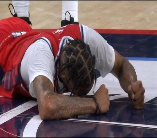 从视频回放中可以看到,当时小琼斯持球过半场,普里查德尝试抢断,结果两人都摔倒,普里查德扑球时疑似压到了小琼斯的腿部,后者显得极为痛苦,一直抱着腿,双手还砸地板。
