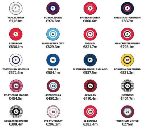 13、马德里竞技(Atletico de Madrid) 西班牙 4.545亿欧元/+11%